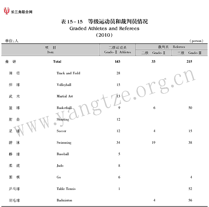 当前位置:首页 > 统计年鉴 > 上海 > 浦东新区 (2011) > 教育、文化、体育、卫生 > 等级运动员和裁判员情况(2010)