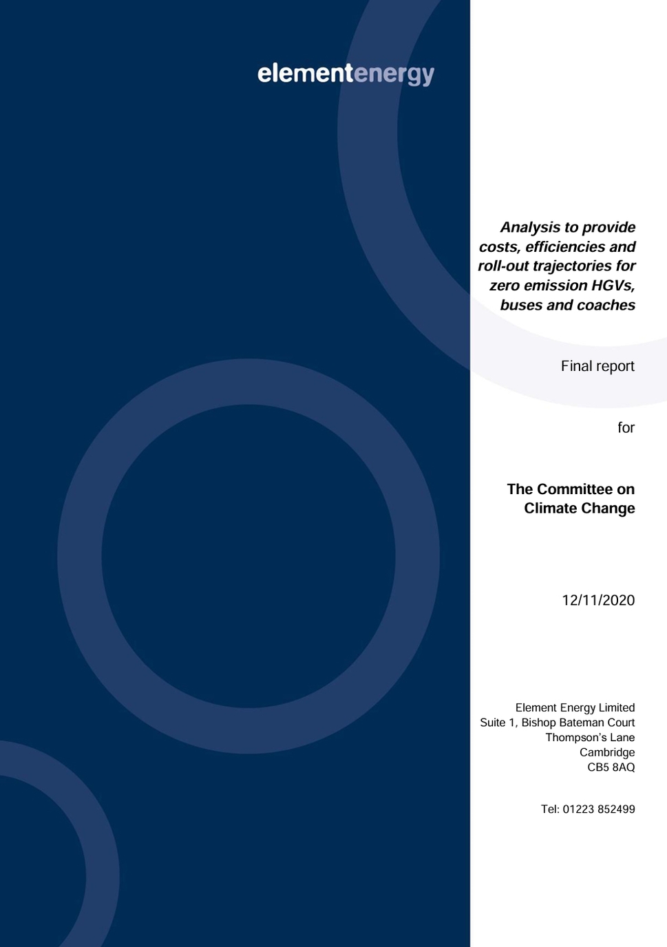 气候变化委员会 (CCC) 委托 Element Energy 评估重型货车 (HGV)、公共汽车和长途汽车采用零碳选项的轨迹。该研究考虑了基于三种技术选择的脱碳途径:具有超快速充电点的电池电动汽车、带有加氢站的氢燃料电池汽车和带有架空电线的受电弓电动汽车。它建立在之前对与这些技术相关的基础设施要求的研究的基础上,CCC 委托 Ricardo Energy and Environment 支持 2019 年净零报告。