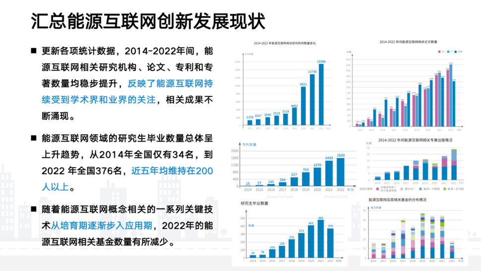 《报告》汇总能源互联网创新发展现状。2014-2022年间,能源互联网相关研究机构、论文、专利和专著数量均稳步提升,反映了能源互联网持续受到学术界和业界的关注,相关成果不断涌现。能源互联网领域的研究生毕业数量总体呈上升趋势,从2014年全国仅有34名,到2022 年全国376名,近五年均维持在200人以上。随着能源互联网概念相关的一系列关键技术从培育期逐渐步入应用期,2022年的能源互联网相关基金数量有所减少。