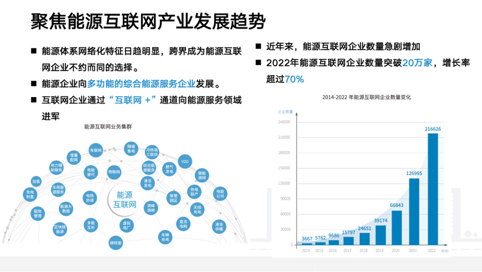 《报告》聚焦能源互联网产业发展趋势。近年来,能源互联网企业数量急剧增加。2022年能源互联网企业数量突破20万家,增长率超过70%。