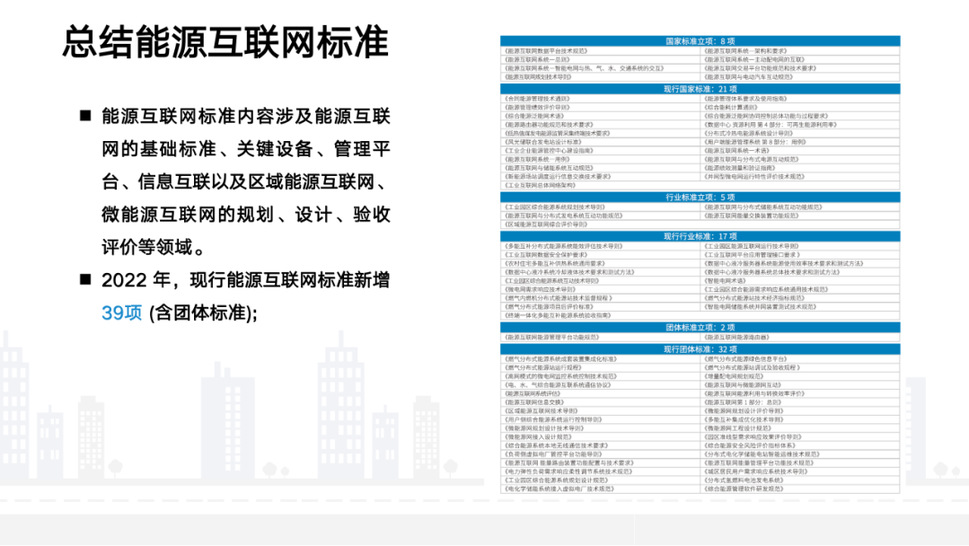《报告》总结了能源互联网标准。2022 年,现行能源互联网标准新增39项 (含团体标准)。