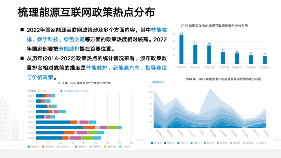 《报告》全面梳理了能源互联网政策热点分布,其中节能减排、数字科技、绿色交通等方面的政策热度相对较高。2020年双碳目标提出是整体顶层设计构建的年份,随着政策落地,大家逐渐关注“源”侧。随着“源”的认知深入,相关的政策数量逐渐在下降。另外,“荷”侧政策在数量不断增多,以新能源为主体的新型电力系统一定需要负荷的参与。能源信息数字化在新时代在双碳下将会发挥越来越多的价值,也意味着越来越多的机会。