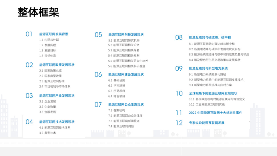《报告》分为12个部分,内容包括:能源互联网发展背景、能源互联网政策发展现状、能源互联网产业发展现状、能源互联网技术发展现状、能源互联网创新发展现状、能源互联网建设发展现状、能源互联网公众生态现状、能源互联网与碳达峰、碳中和、能源互联网与新型电力系统、2022中国能源互联网十大标志性新闻、全球视角下的能源互联网发展现状、专家纵论能源互联网发展。
