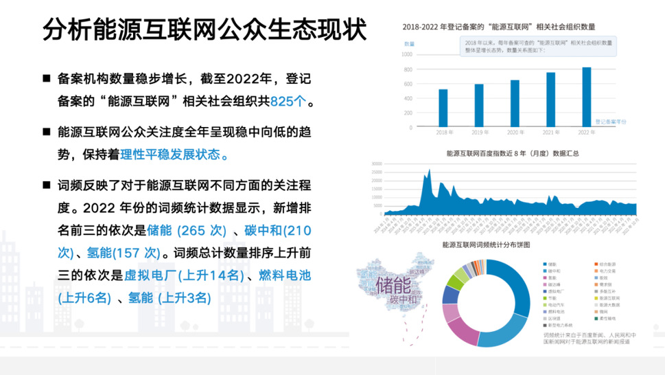 《报告》分析了能源互联网公众生态现状。2022 年份的词频统计数据显示,“储能”成为最热点词汇,储能是构建新型电力系统的支撑性技术。