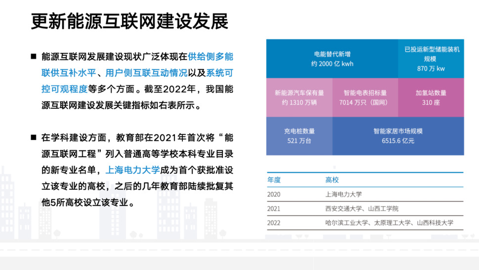 《报告》更新能源互联网建设发展。能源互联网的研究机构在2020年得到了阶跃上升,呈明显阶梯式的上升。毕业生数量也在逐渐上升,近五年比较稳定在200人以上。教育部在2021年首次将能源互联网工程列入普通高等学校本科专业目录。在上海电力大学成为首个获批成立该专业的高校。
