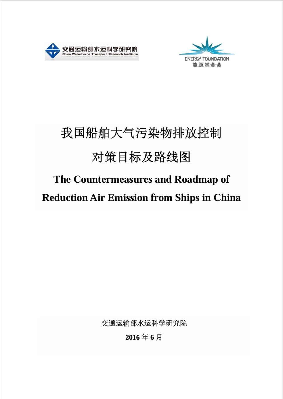 2017年,在能源基金会支持下,交通部水运科学研究院承担“中国船舶和港口空气污染排放控制”部分研究内容,并完成《我国船舶大气污染物排放控制对策目标及路线图》 。该报告借鉴发达国家或地区治理船舶大气污染物排放的经验,综合考虑我国经济社会发展、大气污染治理、水运行业发展、减排技术进步等因素,设计了我国船舶大气污染物排放控制路线图和时间表,以支持相关部门开展船舶污染排放控制,为中国申请国际排放控制区可行性研究提供基础。