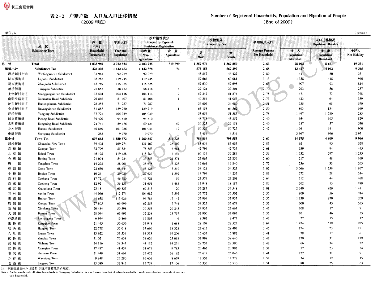 户籍户数、人口及人口迁移情况(2009年底)