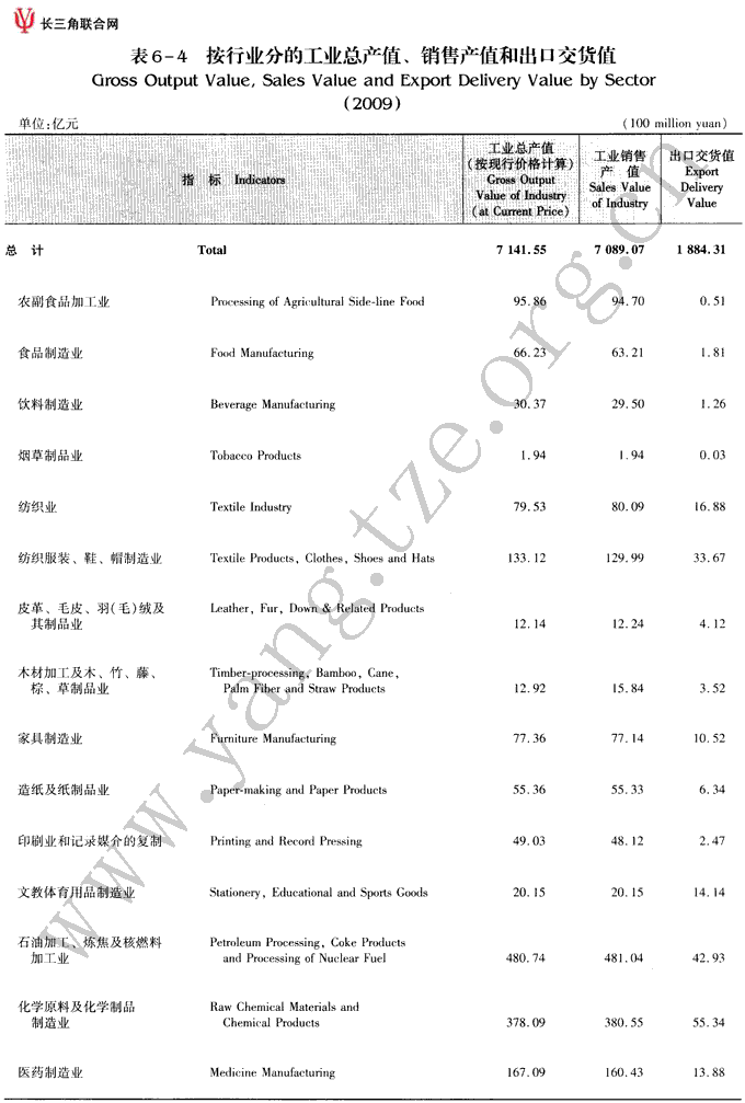 按行业分的工业总产值、销售产值和出口交货值(2009)