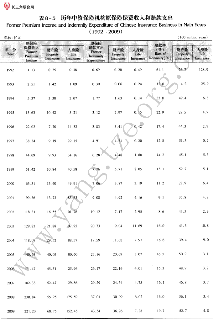 历年中资保险机构原保险保费收入和赔款支出(1992-2009)