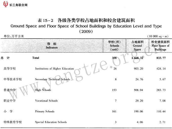 当前位置:首页 > 统计年鉴 > 上海 > 浦东新区 (2010) > 教育、文化、体育、卫生 > 各级各类学校占地面积和校舍建筑面积(2009)